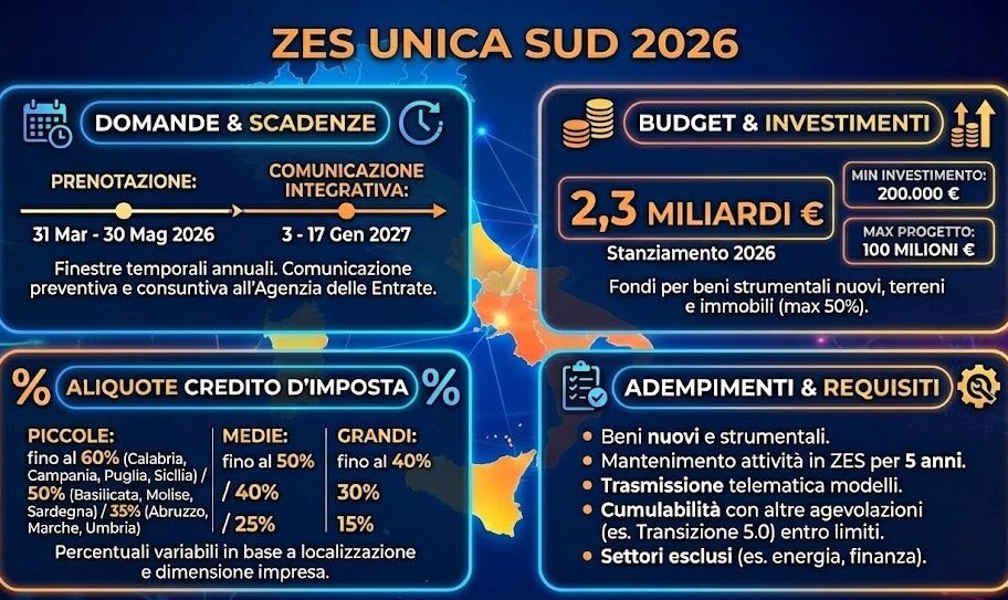 Si avvicina la prima scadenza per il credito d’imposta ZES Unica 2026. Dal 31 marzo 2026 le imprese possono inviare all’Agenzia delle Entrate la comunicazione con le spese già sostenute dall’inizio dell’anno e con quelle previste entro il 31 dicembre. La finestra si chiude il 30 maggio 2026 e sarà seguita, a gennaio 2027, dalla comunicazione integrativa sugli investimenti effettivamente realizzati. Per chi investe nel Mezzogiorno, il bonus passa da qui: tempi corretti, modello giusto e invio telematico senza errori.